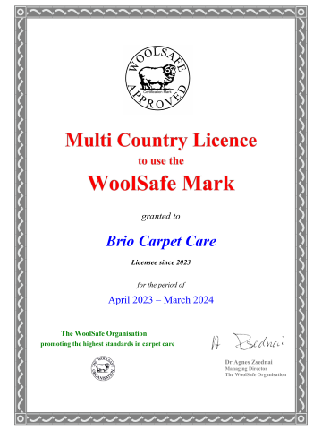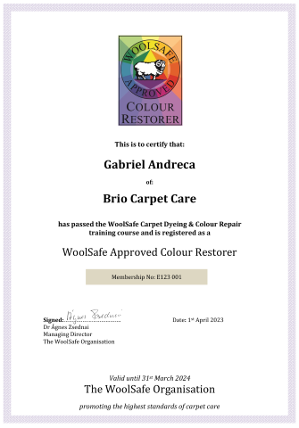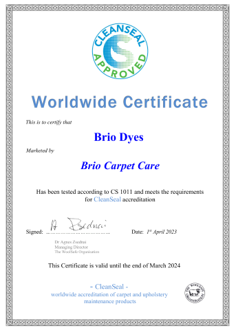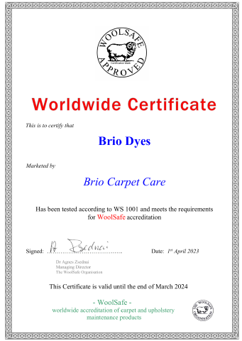 Last year, the Brio Dyes were thoroughly tested by an independent laboratory and became the first WoolSafe Approved dyes for professional carpet and rug dyeing and colour repairs.
